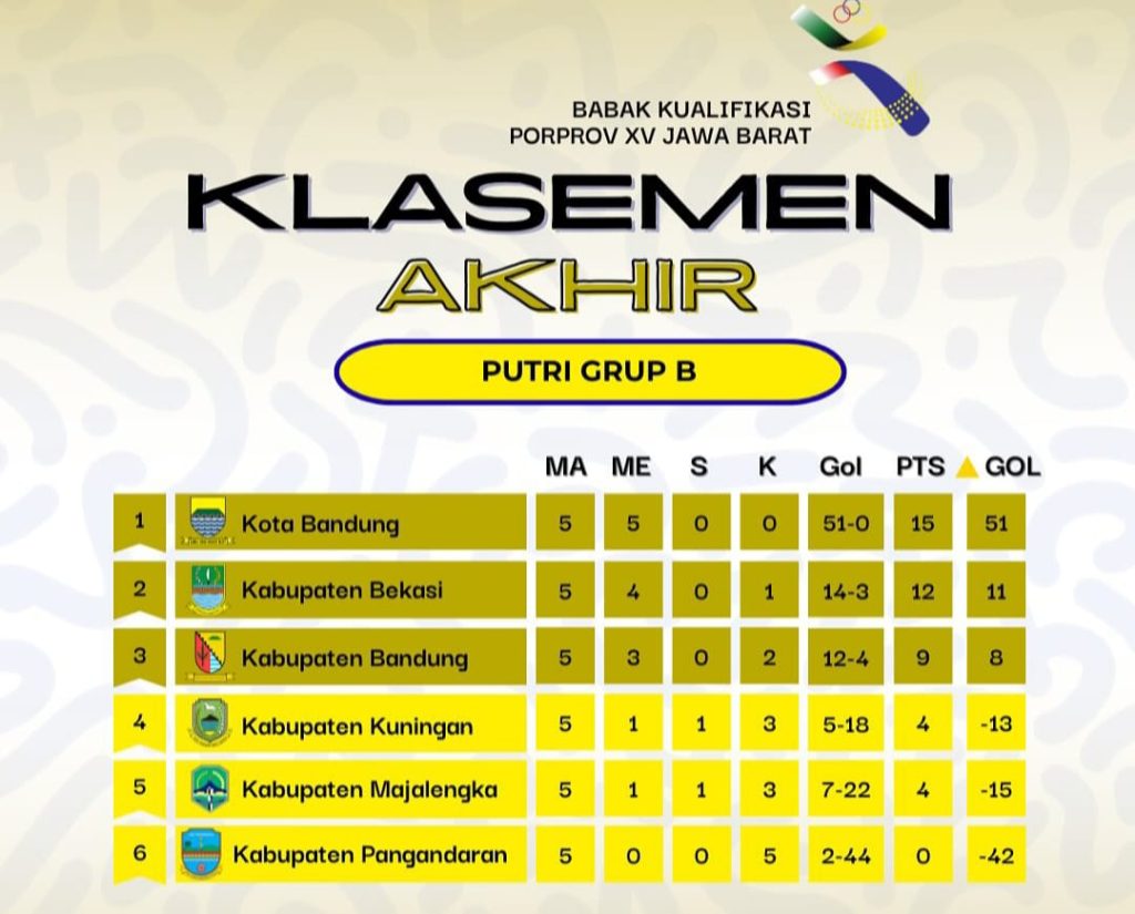 Dari Grup ini  yang lolos yakni kota Bandung yang meriah nilai sempurna 15, Kabupaten Bekasi dengan nilai 12. Lalu, Kabupaten Bandung dengan nilai 9, Kabupaten Kuningan 4 poin sama dengan Majalengka, namun menang selisih gol, dan juru kunci Pangandaran dengan nilai 0 dan kebobolan 44 dan mencetak 2 gol.