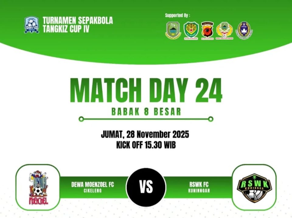 LIPUTAN KUNINGAN– Lagababak 8 besar Turnamen Open Sepakbola Tangkiz Cup 2025, akan dibuka dengan laga super big match antara Dewa Moenzoel Vs RSWK FC. Laga ini akan berlangsung di Lapangan Desa Kramatwangi Kecamatan Garawangi pada Jumat (28/11.2025) pukul 16.00 WIB.