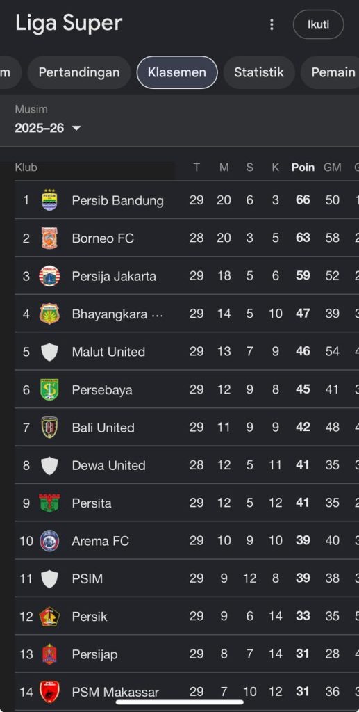 Dengan hasil seri ini maka jarak dengan Bornoe FC hanya tinggal tiga dan dengan Persija kembali 7 poin. Andai pada laga Sabtu (25/4/2026) malam Borneo berhasil menghajar Semen Padang di Samarinda, maka nilainya menjadi sama yakni 66.